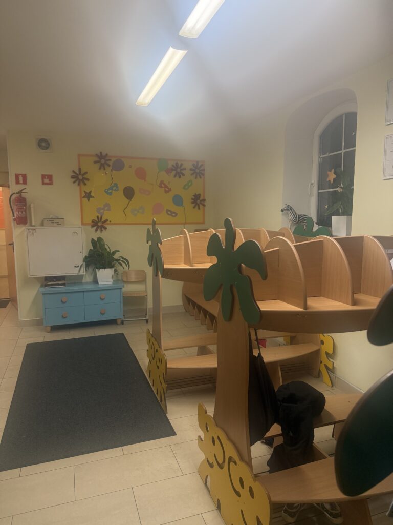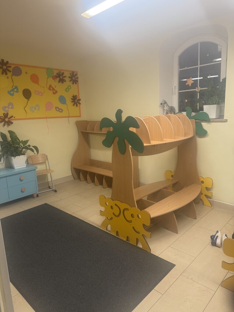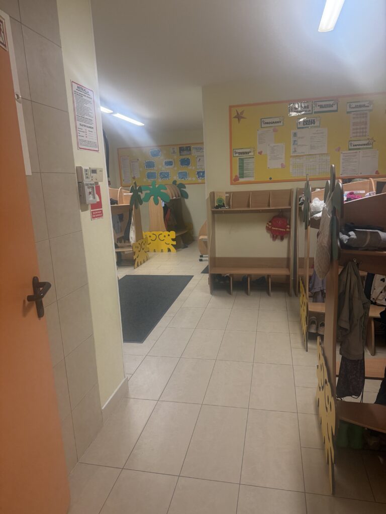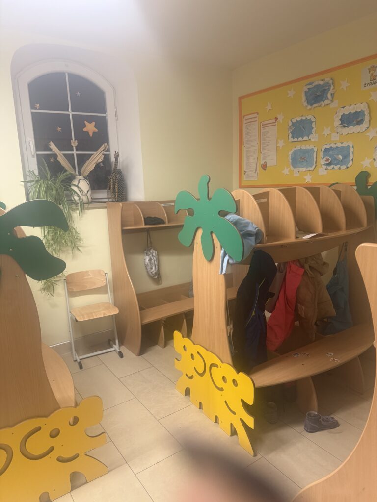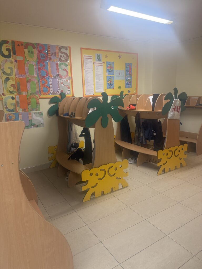 Nasza szatnia jest jasna, przestronna i przyjemnie ciepła dzięki podgrzewanej podłodze. To miejsce, w którym dzieci i rodzice czują się swobodnie od pierwszej chwili. W szatni prezentujemy prace dzieci oraz miesięczne i tygodniowe plany pracy obejmujące obszary: poznawczy, emocjonalny, społeczny i fizyczny. Znajduje się tu również tablica informacyjna dla rodziców, na której umieszczamy tygodniowy plan zajęć z języka angielskiego, a także aktualne wydarzenia i ogłoszenia.