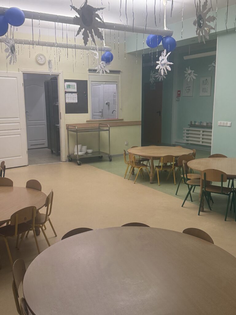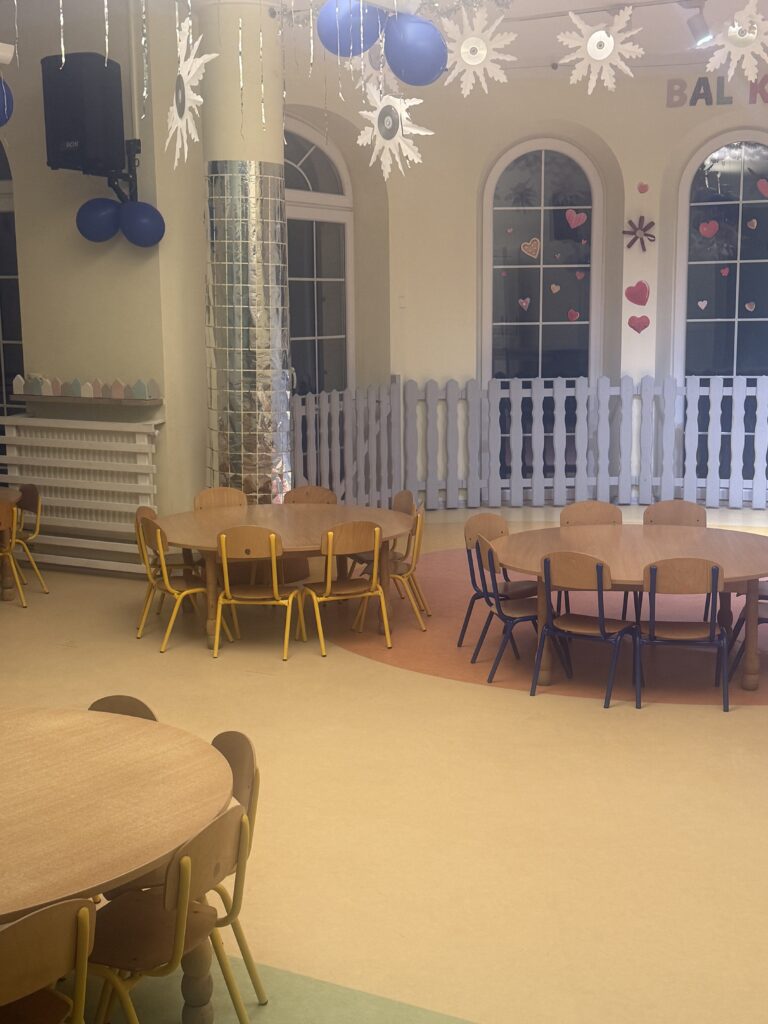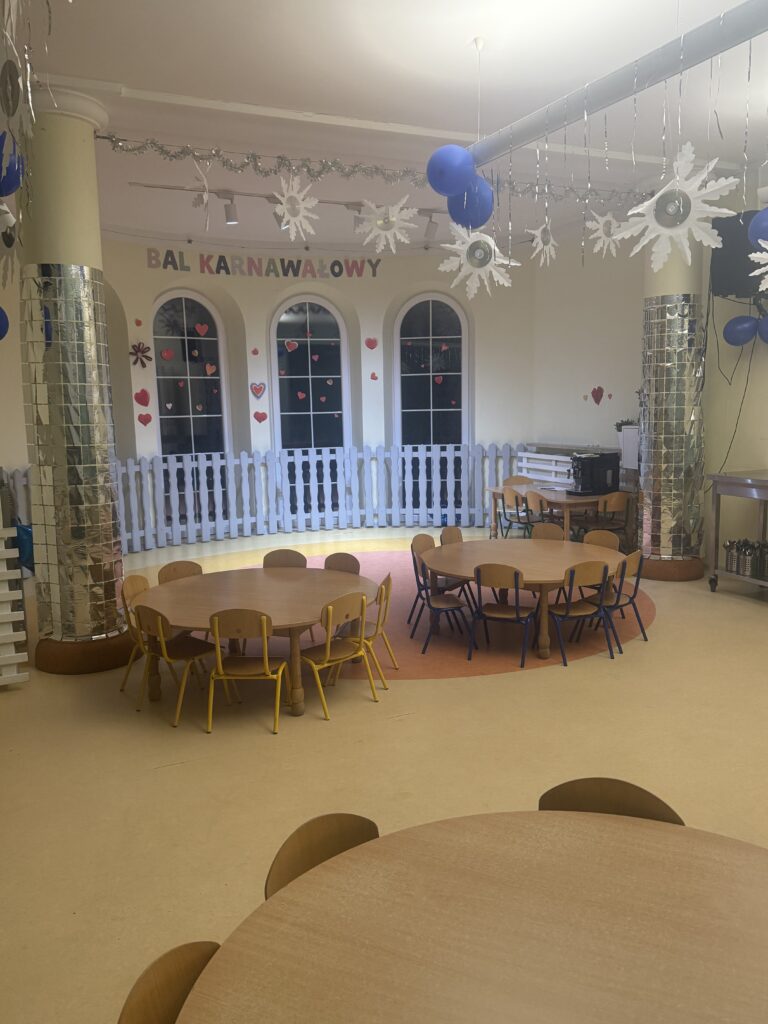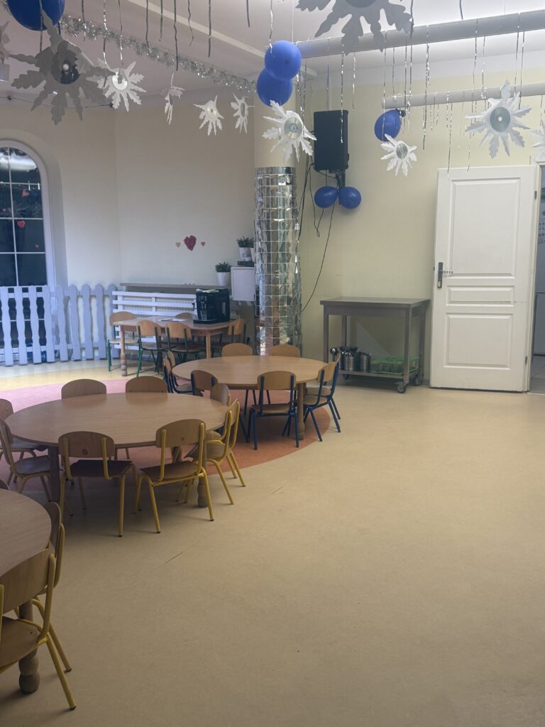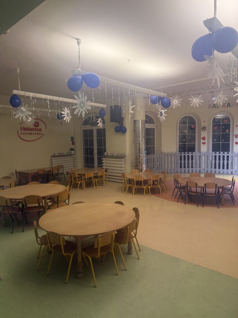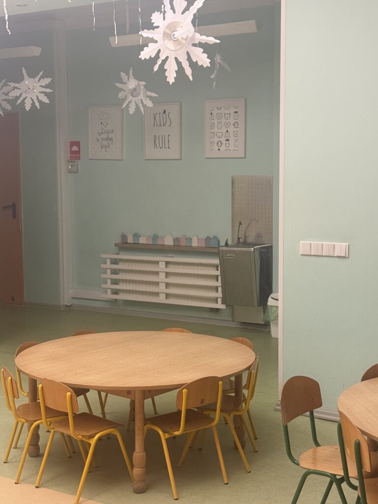 W sercu przedszkola znajduje się przestronna, pełna światła jadalnia, zaprojektowana tak, aby dzieci czuły się w niej swobodnie i bezpiecznie. Naturalne materiały, pastelowe barwy i starannie dobrane dekoracje tworzą atmosferę spokoju i estetyki, sprzyjając kulturze jedzenia i budowaniu dobrych nawyków.