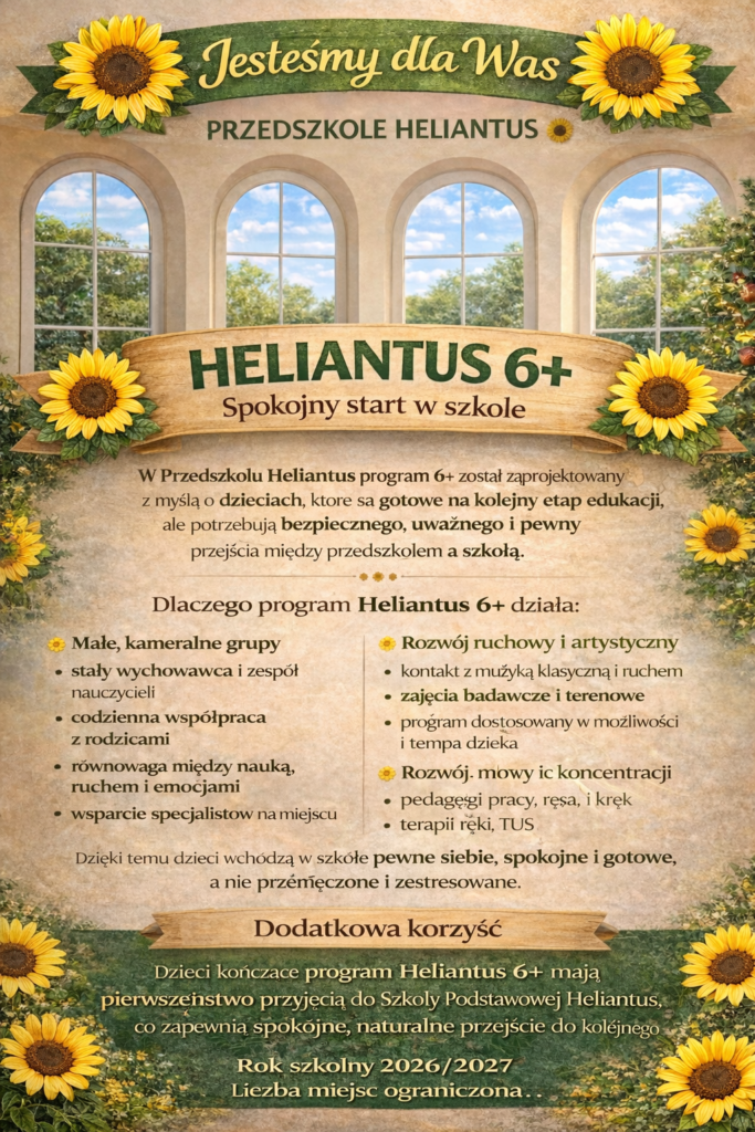 W Przedszkolu Heliantus program 6+ został zaprojektowany z myślą o dzieciach, które są gotowe na kolejny etap edukacji, ale potrzebują bezpiecznego, uważnego i mądrego przejścia między przedszkolem a szkołą.
