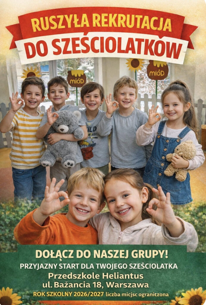 Od 6 lutego rozpoczynamy zapisy do grupy sześciolatków w Przedszkolu Heliantus. To wyjątkowy czas w życiu dziecka — moment, w którym buduje pewność siebie, rozwija samodzielność i przygotowuje się do szkolnej przygody w atmosferze bezpieczeństwa, bliskości i radości.